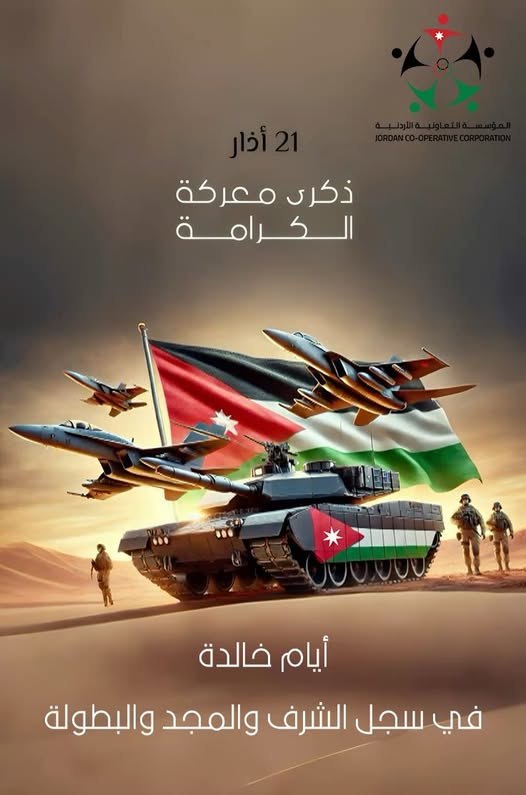 في ذكرى معركة الكرامة الخالدة، والتي انتصر فيها الحق على الباطل، نستحضر بطولات القوات المسلحة الأردنية -الجيش العربي، في تسطير أسمى معاني الشجاعة والتضحية والبطولة في الدفاع عن الوطن، ودحر العدو عن أرض الأردن، وبذل الدماء رخيصةً ليبقى الأردن عزيزاً شامخاً يُعانق العلياء بكبرياء الرجال الأوفياء .