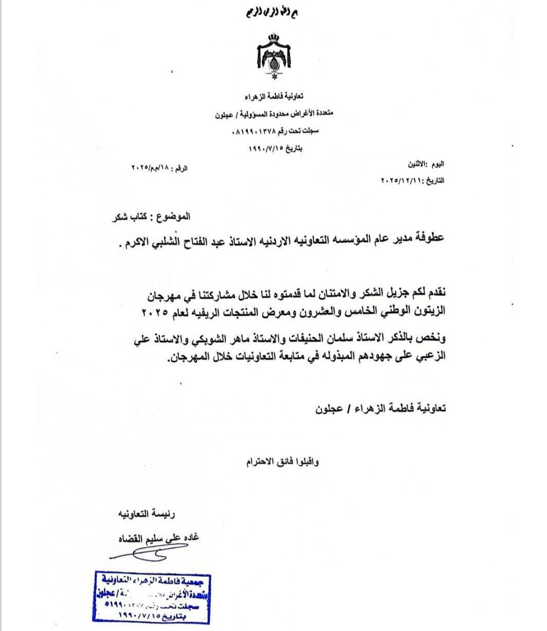 تلقى عطوفة المدير العام عبدالفتاح الشلبي كتاب شكر من تعاونية فاطمة الزهراء في محافظة عجلون، تقديراً لجهود المؤسسة في دعمها خلال المشاركة في مهرجان الزيتون الوطني الخامس والعشرين ومعرض المنتجات الريفية.
